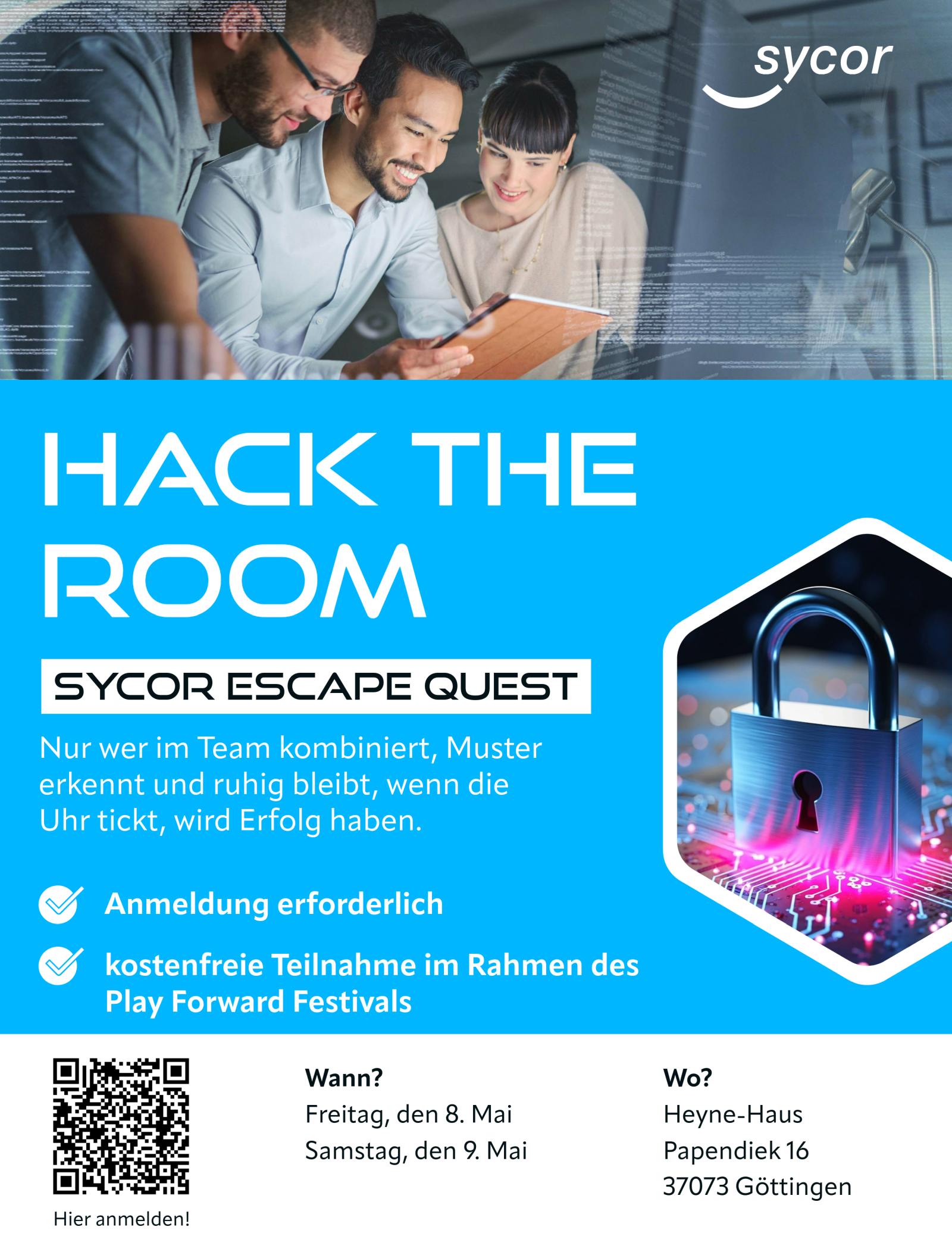 Anmeldung direkt über diesen Link: Sycor Escape Quest – Hack the Room. Beat the System.